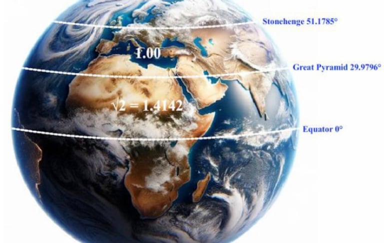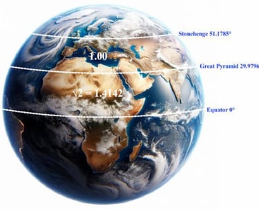 This is the discovery of Carl Balowski, who has done a lot of work with the Silver Ratio. He shows that if the distance from the Stonehenge latitude to the Great Pyramid latitude is taken as 1, then the distance from the Great Pyramid latitude to the Equator is 1.4142, essentially the square root of 2!